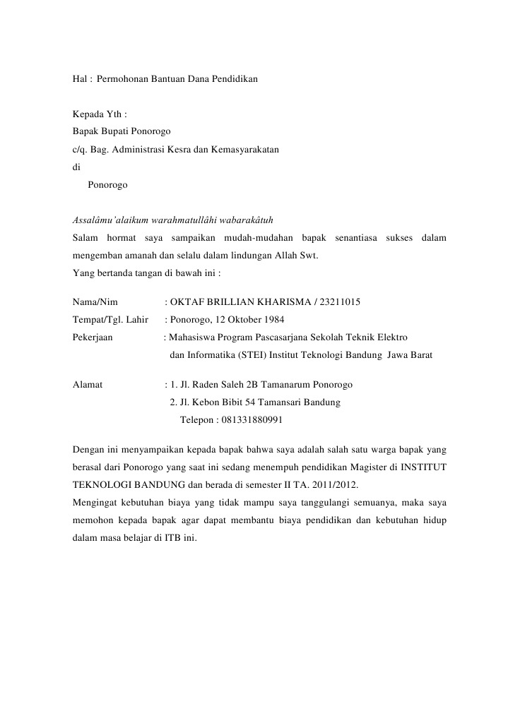 Kepada ykh direktur pt. Untuk bisa menyelesaikan program pendidikan sampai ke jenjang s1 strata 1 baik bantuan dana pendidikan maupun lainnya akan dapat membantu terhadap kelancaran proses pendidikan yang sedang berlangsung. Terimakasih yang sebesar besarnya atas kebersedian bapak bupati untuk menberikan bantuan.