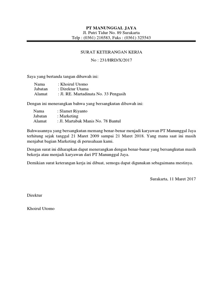 Contoh Surat Keterangan Kerja Yang Baik