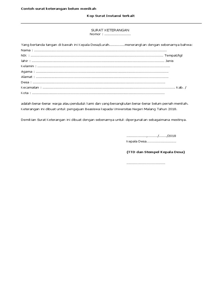 Contoh Surat Keterangan Belum Menikah