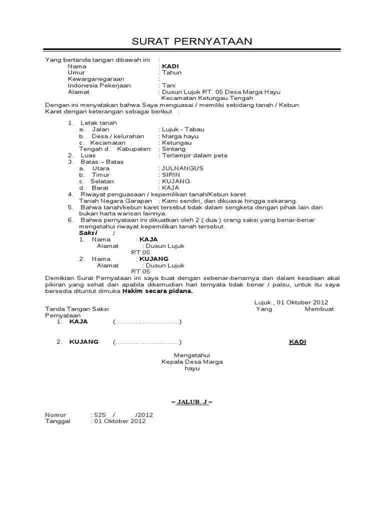 Surat pernyataan tidak sengeketa sendiri merupakan surat yang berisi pernyataan statement dari seseorang atau sekelompok orang yang menyatakan tidak dalam sengketa atas suatu barang tertentu atau hal lainnya dengan pihak manapun. Surat keterangan tanah atau skt adalah surat yang menjelaskan status kepemilikan tanah dan detail tanah yang dikeluarkan oleh pejabat desa biasanya kelurahan dan kecamatanskt terkadang dibutuhkan saat jual beli tanah mau dilakukanskt dibuat agar lebih bisa menjelaskan status tanah selain sertifikatskt ini cukup penting dan jangan mencoba aneh aneh karena harta biasanya menyebabkan panas dan bisa berujung ke bui atau penjara. Surat keterangan kepemilikan tanah berikut ini contoh surat keterangan kepemilikan tanah semoga berguna bagi anda yang sedang membutuhkannya.