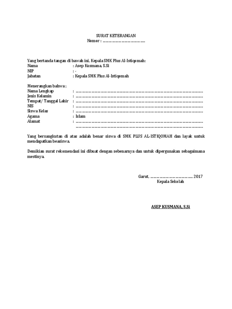 Contoh Surat Rekomendasi Beasiswa Dari Kepala Sekolah