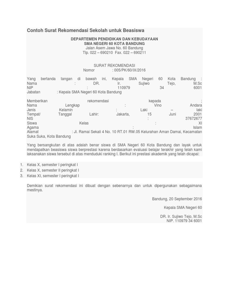 Contoh surat rekomendasi beasiswa dari kepala sekolah. Contoh surat rekomendasi dari sekolah sekarang ini banyak kegiatan yang diselenggarakan oleh pihak pemerintah maupun pihak swasta dengan melibatkan anak anak sekolah. Salah satu syarat tersebut ialah surat rekomendasi kepala sekolah. Para peserta yang merupakan utusan dari sekolah masing masing datang mengikuti sebuah acara yang tentunya sudah dibekali dengan surat rekomendari dari sekolah masing masing.