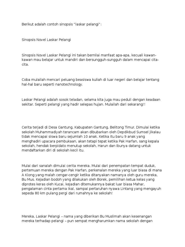 Unsur intrinsik adalah unsur pembangun sastra dalam atau yang ada dalam sastra itu sendiri. Cerpen dan novel adalah salah satu karya sastra. Berikut adalah contoh sinopsis laskar pelangi.