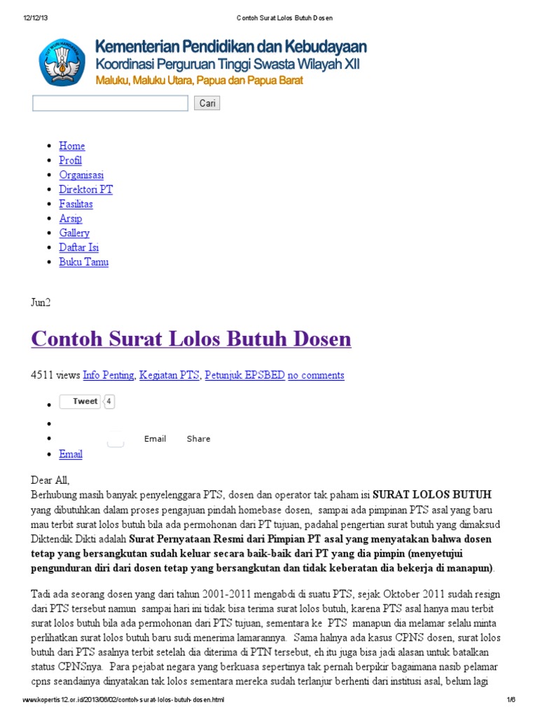 Contoh Surat Lolos Butuh Dosen