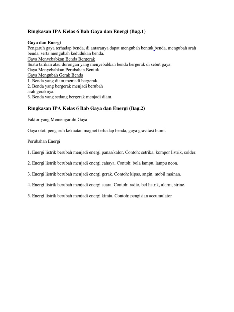 Ringkasan Ipa Kelas 6 Bab Gaya Dan Energi