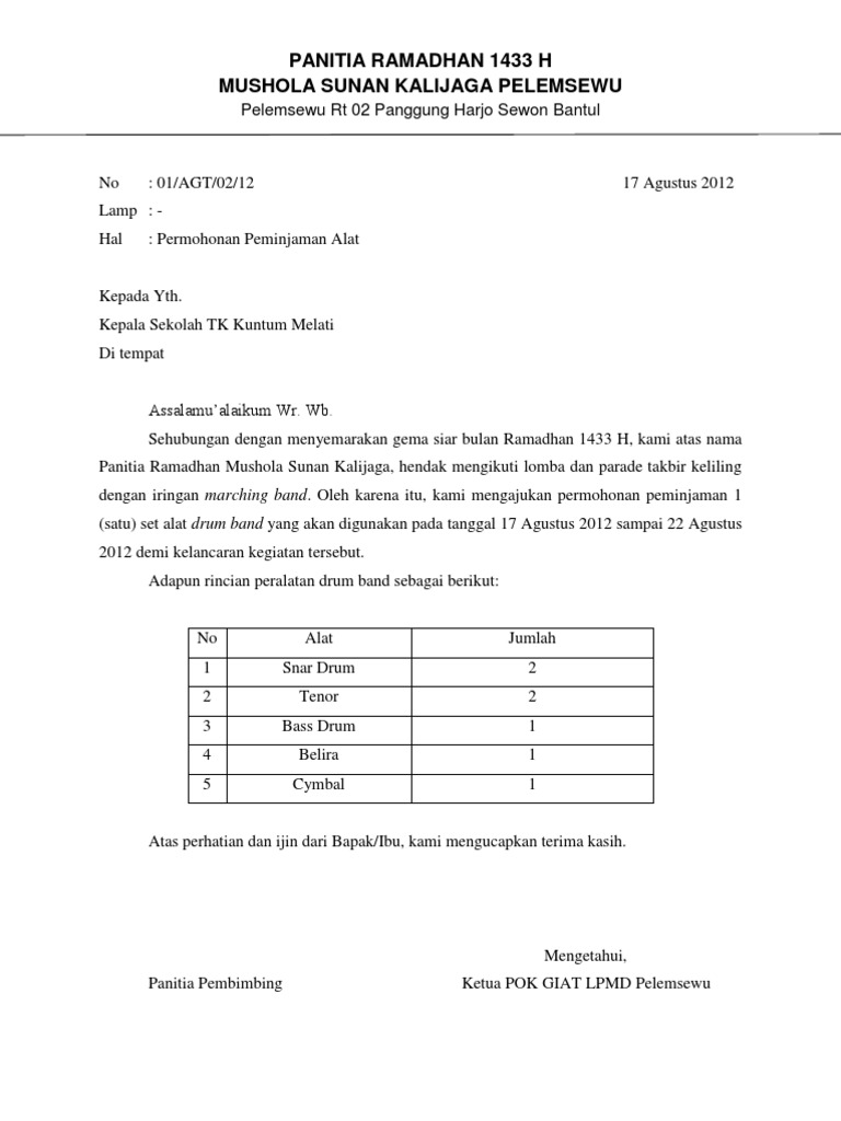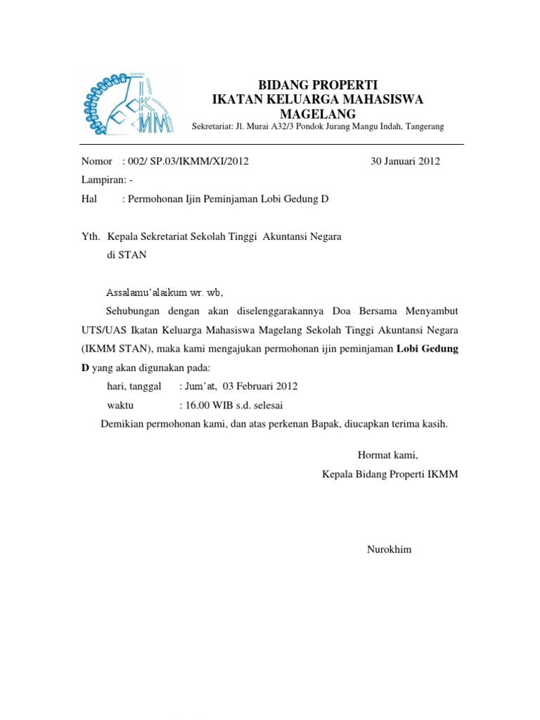 Contoh Surat Peminjaman Tempat Dan Perlengkapan
