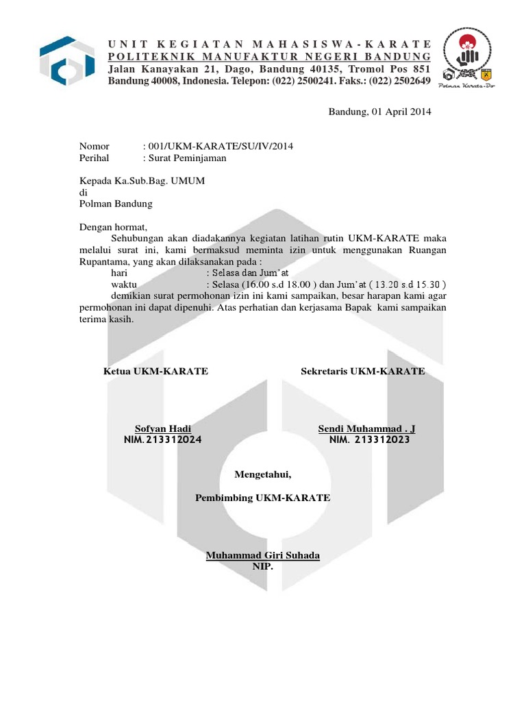 Contoh Surat Permohonan Pinjam Tempat Kegiatan Pelatihan Oleh
