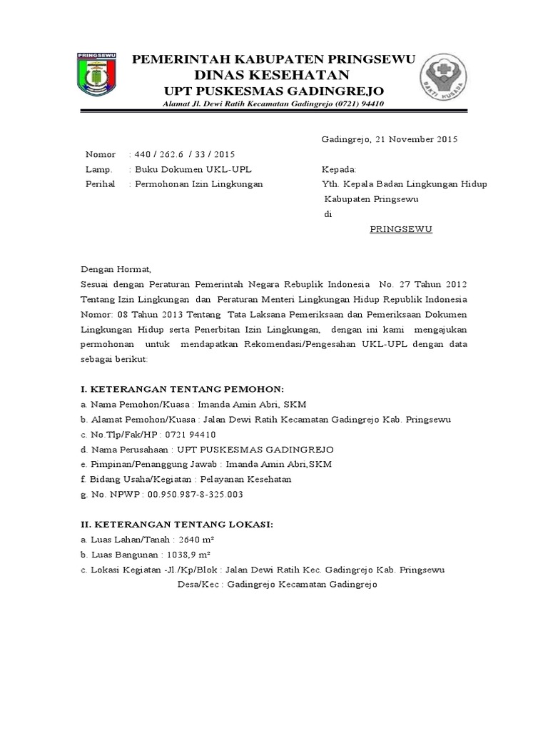 Contoh permohonan izin lingkungan. Contoh surat permohonan hay sobat sharing pada kesempatan ini saya akan sharing tentang contoh surat permohonan untuk berbagai keperluan. Contoh surat izin lingkungan download as word doc doc docx pdf file pdf text file txt or read online. 13 contoh surat permohonan dana izin bantuan kerja dll penulisan benar january 15 2019 may 2 2018 by arifin saddoen contoh surat permohonan dalam hidup kita pasti sering yang mananya dihadapkan dengan sebuah masalah.
