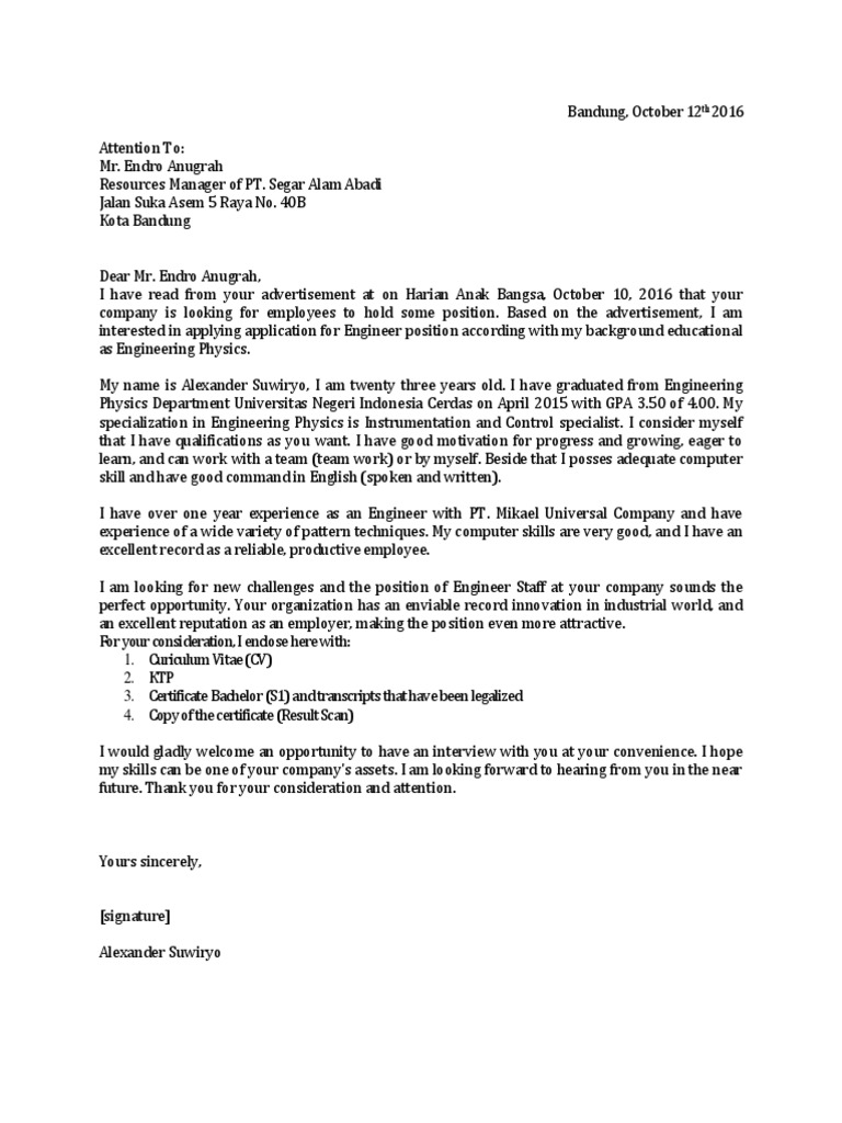 Contoh Surat Lamaran Kerja Bahasa Inggris Untuk Teknik Fisika