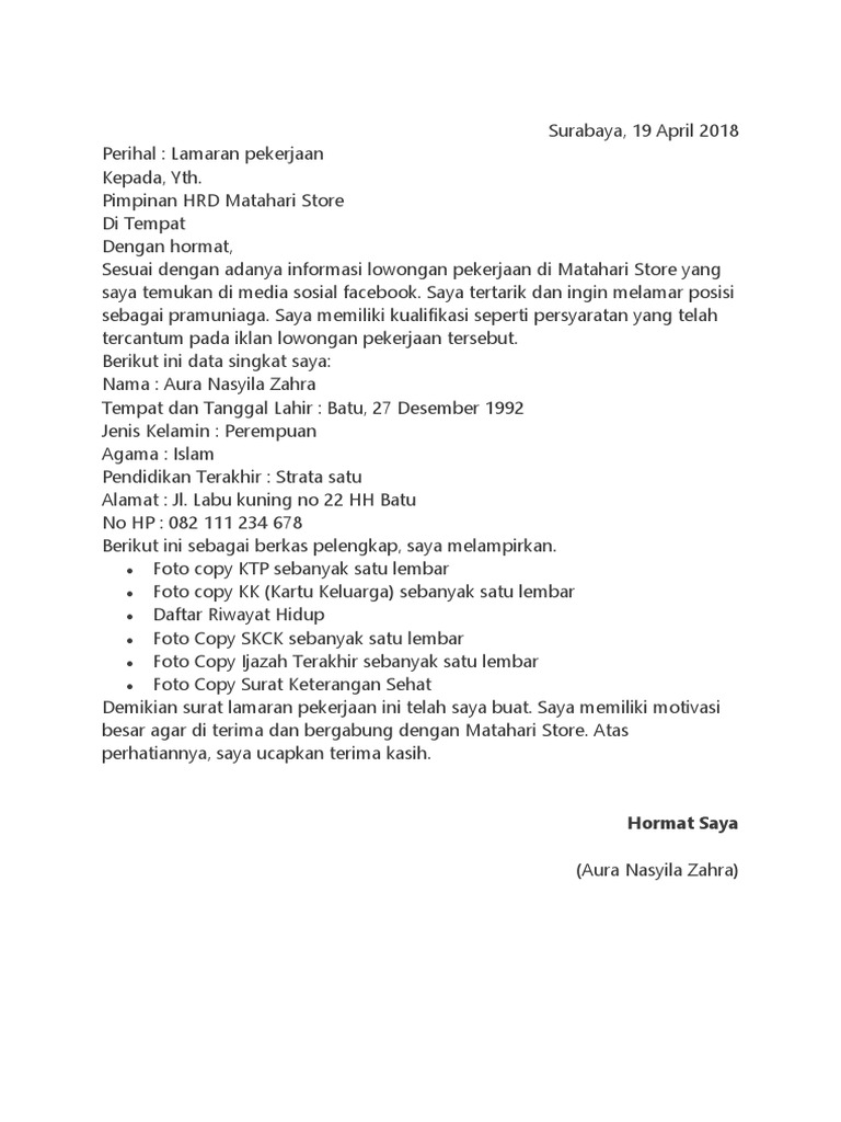 Contoh Surat Lamaran Kerja Bagian Pramuniaga Www Gambar Wiki