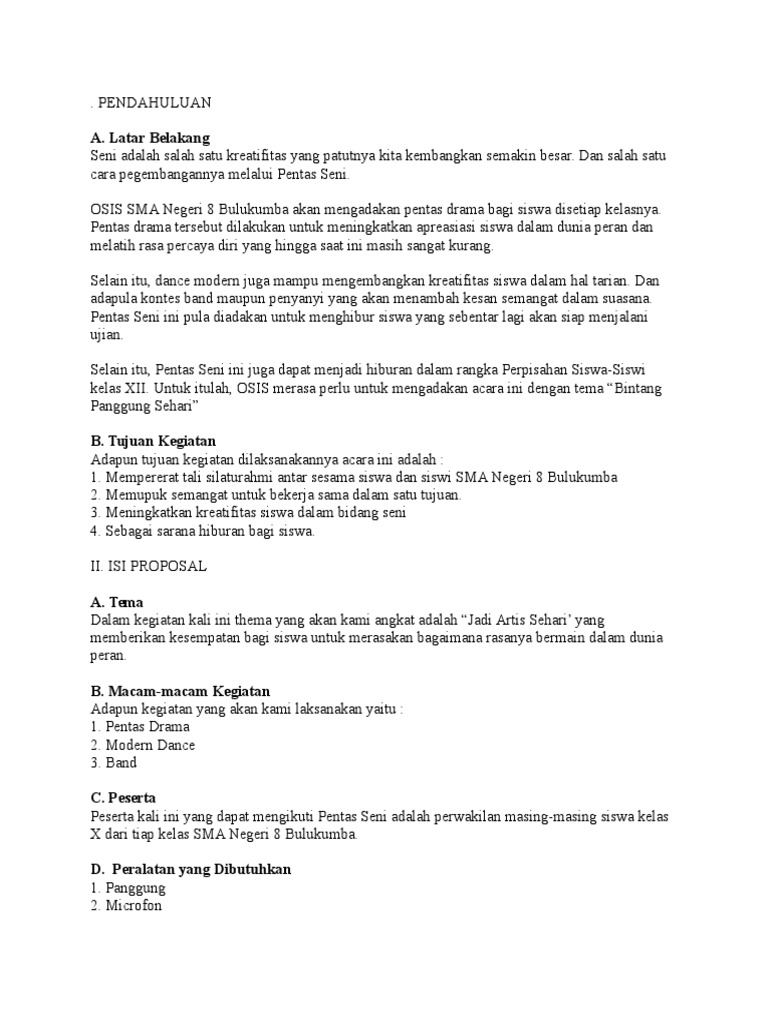 Buat anda yang kebetulan akan membuat proposal kegiatan sekolah berikut adalah contoh dari proposal kegiatan sekolah yang bisa dijadikan sebagai rujukan. Semoga dalam acara pentas seni ini bisa berjalan dengan baik dan semoga bisa menjadi ajang tahunan yang akan terus bisa dilaksanakan. Proposal pentas seni pensi sma negeri 2 bantaeng pendahuluan kegiatan pentas seni merupakan ajang kreativitas yang digalang oleh pecintasenidalam meningkatkan bakatnyapentas seni juga merupakan budaya yang perlu dilestarikan.