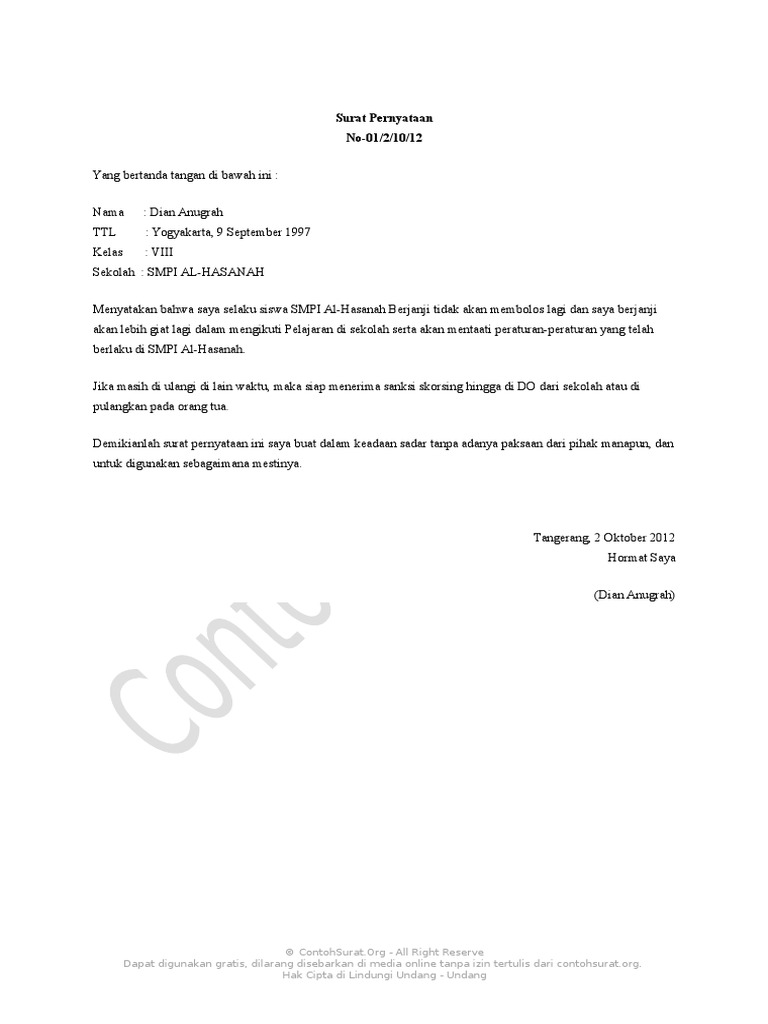 Contoh Surat Pernyataan Tidak Membolos Sekolah