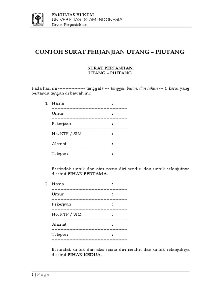Contoh Surat Perjanjian Utang Piutang Fh Uii