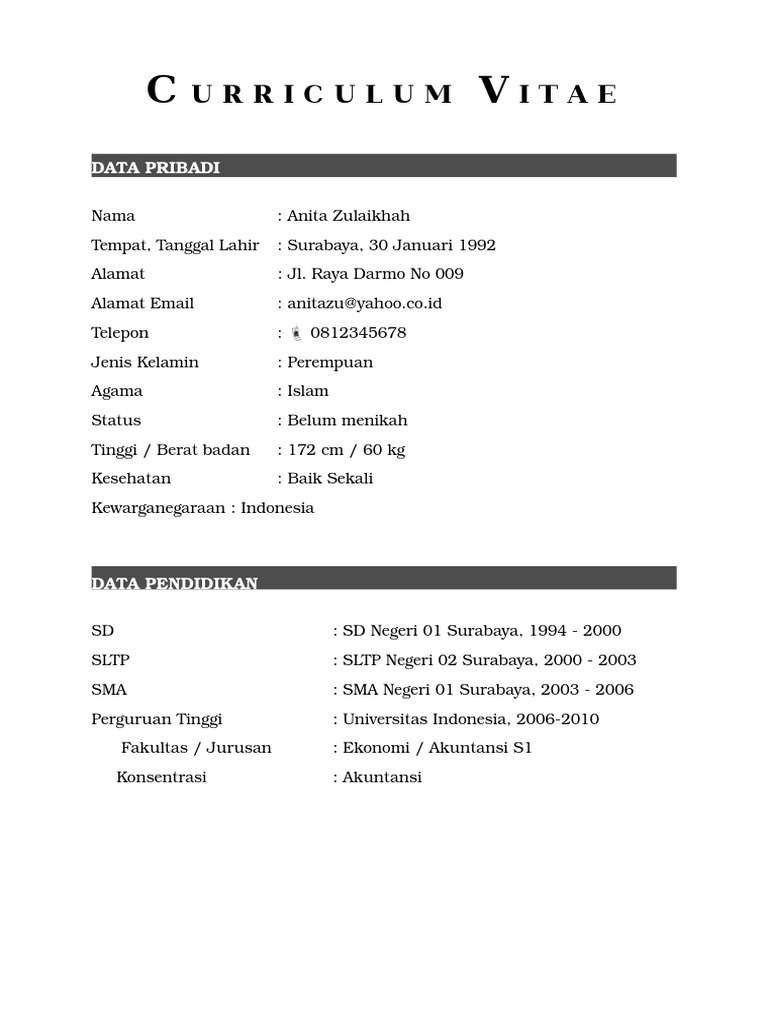 Contoh cv bahasa indonesia. Contoh curriculum vitae dalam bahasa indonesia kali ini sengaja kami membahas contoh curriculum vitae terbaru yang benar dan lengkap dalam bahasa indonesia. Contoh cv lamaran kerja curiculum vitae bahasa indonesia yang baik contoh surat contoh cv cv adalah singkatan dari curriculum vitae yang dalam bahasa indonesia disebut juga daftar riwayat hidup. Cv merupakan aspek penting pertama yang dapat membuat surat lamaran kerja terlihat menjualmenarik di mata hrd.