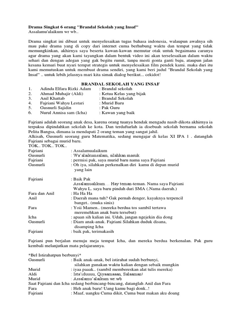 Contoh naskah drama 6 orang tentang pendidikan naskah drama merupakan sebuah bentuk sajian tulisan yang berfungsi sebagai kendali utama jalannya cerita dalam pementasan lakon drama. Dari sekian contoh teks drama naskah naskah drama tersebut diantaranya ada yang bertema persahabatan komedi dan juga lainnya. Apa itu teks drama.