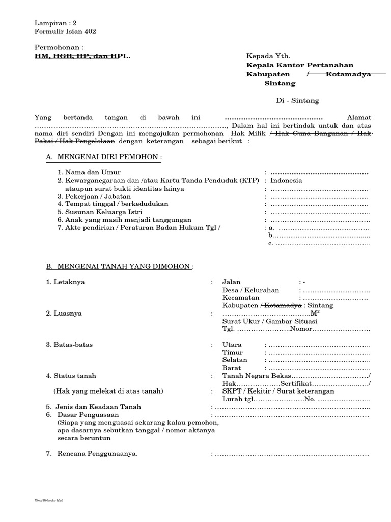 Dalam hal pemisahan sertifikat diatas untuk tiap bidang harus dibuatkan surat ukur buku tanah dan sertipikat untuk menggantikan surat ukur buku tanah dan sertipikat asalnya. Daftar lampiran dokumen permohonan sppt sni untuk permohonan awal no jenis dokumen perusahaan terlampir v pemeriksaan lspro hasil pemeriksaan keterangan 1 daftar isian permohonan a. Contoh permohonan ke bpnkantah perihal.