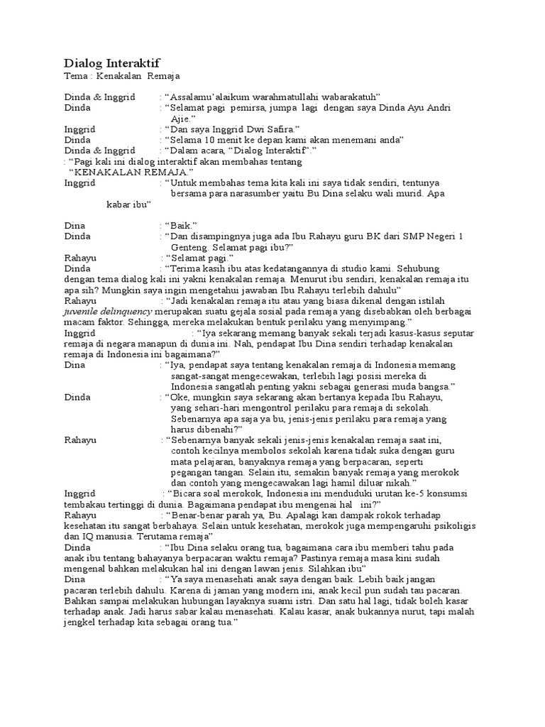 Contoh teks dialog interaktif 2017 adalah materi teks yang ditemukan pada kelas ix contoh dialog interaktif ini sangat sering kita jumpai di berbagai media massa terutama televisi dan radio. Juga dicantumkan kesimpulan yang dapat dipakai untuk referensi untuk dapat melakukan wawancara. Dialog interaktif merupakan percakapan yang dilakukan di media televisi atau radio yang bisa melibatkan pendengar dan pemirsa lewat telepon.