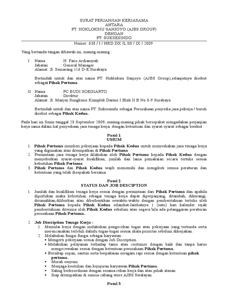 Contoh Surat Perjanjian Kerjasama Perusahaan Doc