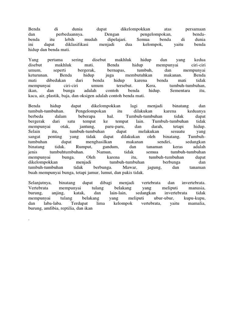 Mungkin benda yang terletak di perbatasan antara benda hidup dan benda mati adalah virus. Air udara tanah batu dan lain lain kata kata yang mempunyai makna yang sama dengan kata mengelompokkan adalah mengklasifikasi menggolongkan. Tumbuhan dan haiwan adalah benda hidup.