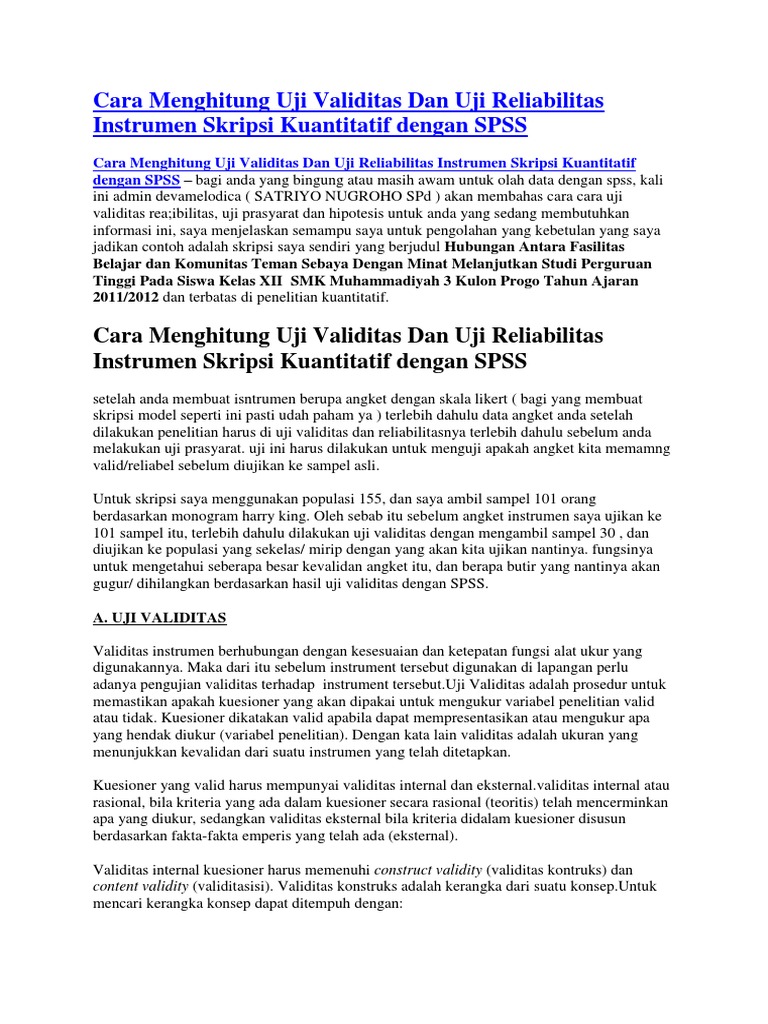 Kuesioner kepada responden yang terhormat bersama segala kesibukan saudarasaudari perkenankan saya memohon saudarasaudari untuk mengisi kuesioner ini. Setting variabel input data pemetaan responden pemetaan jawaban responden compute variabel menguji kualitas data uji regresi melakukan regresi uji asumsi klasik yang disertai dengan penjelasan lengkap. Pengukuran tingkat validitas dapat dilakukan dengan tiga cara.