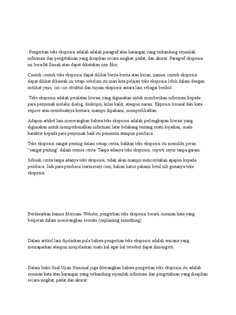 Pengertian teks eksposisi pengertian teks eksposisi adalah paragraf atau karangan yang terkandung sejumlah informasi dan pengetahuan tentang sesuatu yang disajikan secara singkat padat dan akurat sehingga bisa memperluas pengetahuan pembaca. Paragraf eksposisi ini bersifat ilmiah atau dapat dikatakan non fiksi.