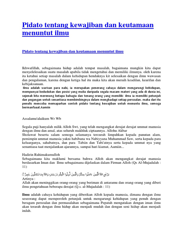 Contoh pidato keutamaan menuntut ilmu kumpulan contoh pidato santri dan umum free islamic blogger template kumpulan contoh pidato santri dan umum kumpulan contoh pidato tatacara sholat fardhu. Allah swt dan rasulnya telah menegaskan pada kita semua tentang keharusan dalam menuntut ilmu melalui firman dan sabda sabdanya. Pidato tentang kewajiban dan keutamaan menuntut ilmu ikhwafillah sebagaimana hidup adalah tempat masalah bagaimana mungkin kita dapat menyelelesaikan suatu masalah apabila tidak mengetahui dan memiliki ilmunya.