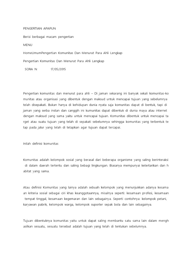 Pengertian komunitas adalah kelompok sosial yang nyata yang terdiri dari individu individu dengan berbagai peran dan latar belakang yang mempunyai satu tujuan tertentu hendro puspito dalam ilmu biologi definisi dari komunitas adalah kumpulan dari beberapa populasi yang berkumpul dan hidup bersama dalam suatu wilayah lingkungan tertentu. Semoga dengan adanya penjelasan ini bisa memberikan wawasan dan juga memberikan pengetahuan bagi senegap pembaca yang sedang mendalamii arti komunitas.
