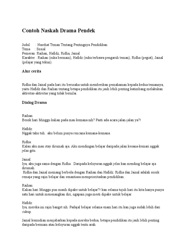 Dalam artikel sebelumnya kami sudah membahas mengenai tentang pengertian drama sejarah drama jenis drama unsur unsur drama ciri ciri drama dan tujuannya. Nah dalam artikel ini kita akan coba mengulas tentang berbagai macam naskah drama. Contoh naskah drama pendek persahabatan lucu 3 4 orang april 16 2018 januari 24 2018 oleh kang santri naskah drama naskah drama merupakan salah satu karya sastra yang sampai saat ini masih lumayan popular di berbagai kalangan masyarakat indonesia maupun di dunia.