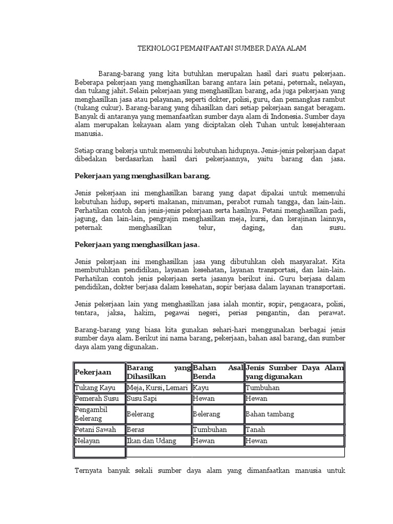 Dalam pemanfaatan sumber daya alam memerlukan ilmu pengetahuan dan teknologi antara lain cara penggunaan teknologi yang tepat dan ekonomis agar hasilnya sesuai dengan yang diharapkan dan tidak mengganggu lingkungan. Dengan pengelolaan yang baik tentunya kegiatan ini akan menunjang kebutuhan manusia akan bahan makanan yang merupakan salah satu kebutuhan primer. Pemanfaatan sumber daya alam pemanfaatan sumber daya alam di indonesia secara lengkap sumber daya alam memiliki peran dalam pemenuhan kebutuhan manusia.
