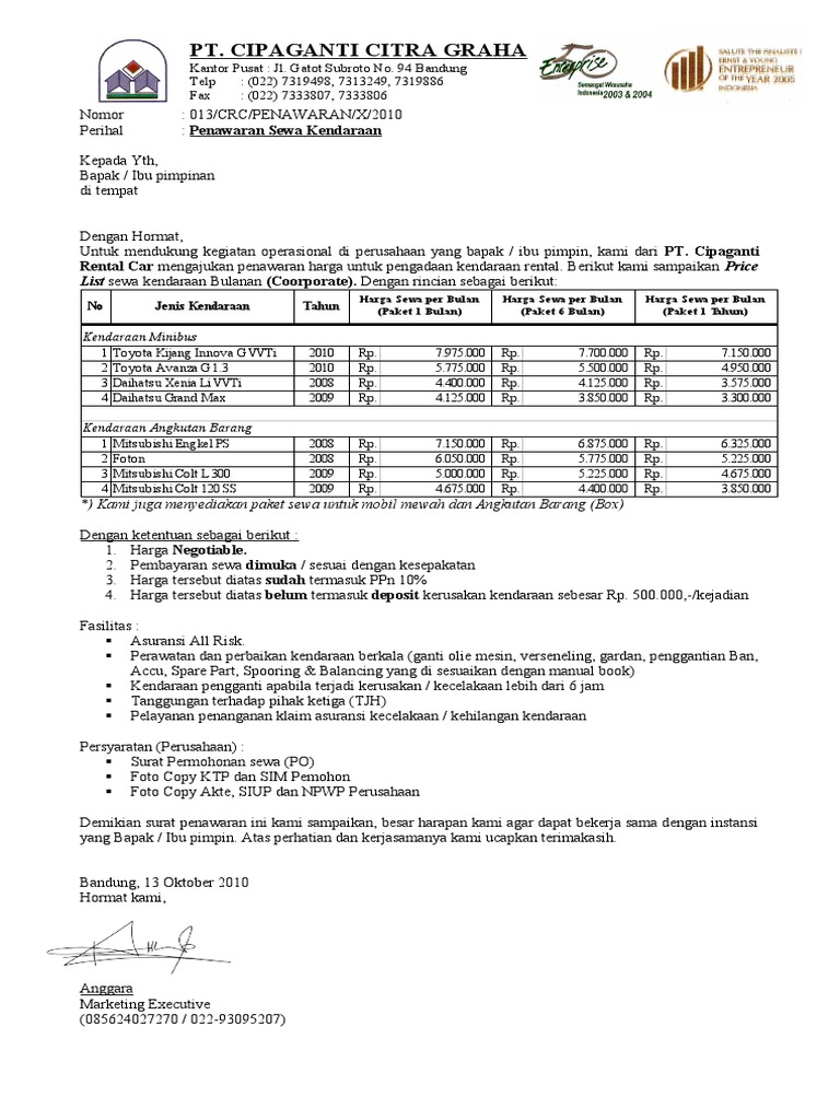 Canggih abadi perbaikan pemasangan dan perawatan jl. Contoh surat penawaran rental mobil ke perusahaan istilah penting dalam hal mempromosikan sebuah perusahaan yang sedang anda geluti dengan itu niscaya akan terasa cepat amju di kala rental mobil yang anda miliki di sebarluaskan dalam bentuk brosur atau surat penawaran kepada orang lain atau ke perusahaan penting lainya. Yogyakarta 21 april 2018.