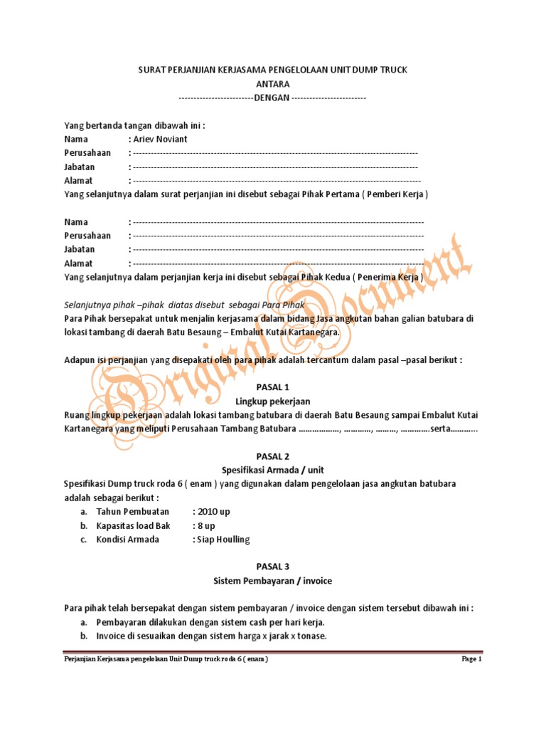 Surat Perjanjian Kerjasama Pengelolaan Unit Dump Truck
