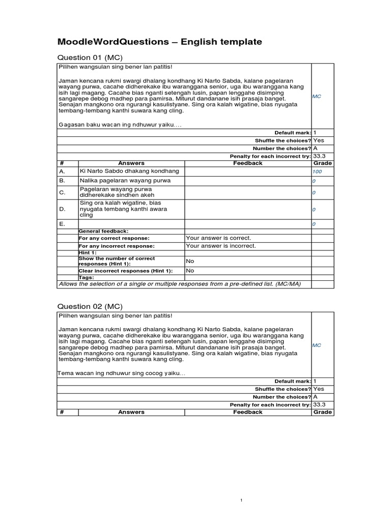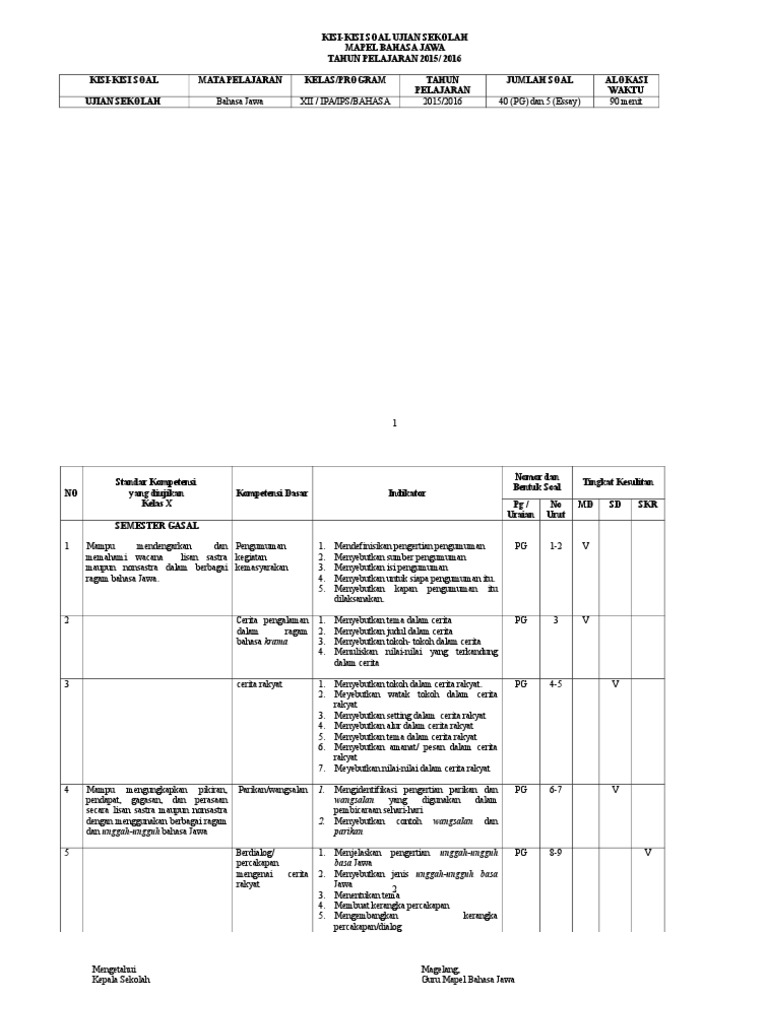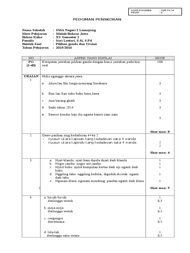 Pedoman Penskoran Uas Sem 2 Bahasa Jawa Kelas 2