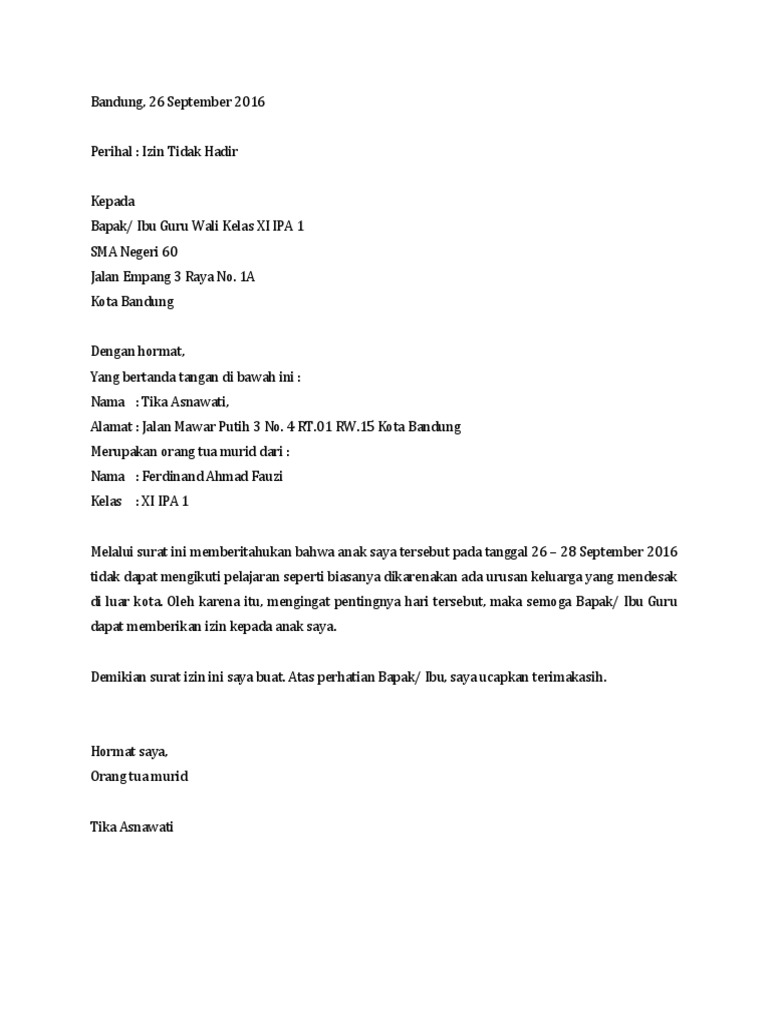Contoh Surat Tidak Hadir Ke Sekolah Karena Urusan Keluarga Docx