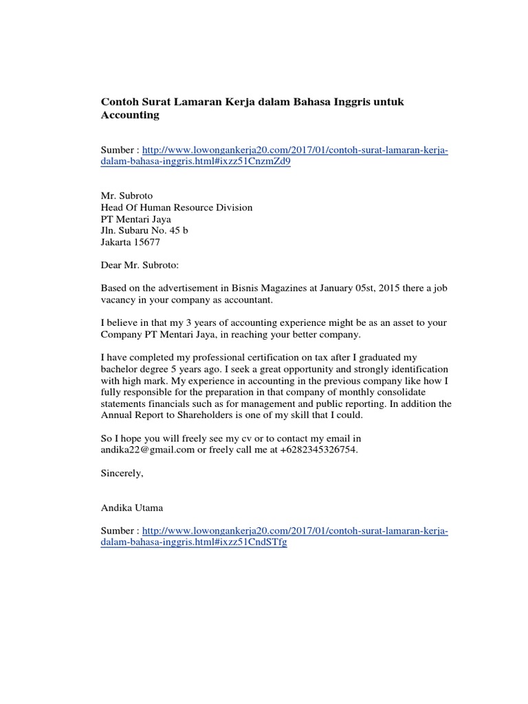 Contoh surat lamaran pekerjaan dalam bahasa inggris 2018 cara membuat surat lamaran pekerjaan berbahasa inggris sebetulnya gampang gampang susahjika anda belum terbiasa membuatnya atau kemampuan bahasa inggris anda masih minim silahkan anda perhatikan beberapa contoh modelnya. Contoh surat lamaran kerja bahasa inggris semakin banyaknya penduduk indonesia menyebabkan semakin banyaknya saingan untuk mencari kerja. Contoh surat lamaran pekerjaan dalam bahasa inggris 2018 contoh surat lamaran pekerjaan dalam bahasa inggris 2018 cara membuat surat lamaran pekerjaan berbahasa inggris sebetulnya gampang gampang susah.