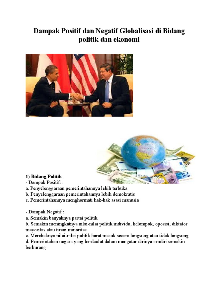 Mengetahui dampak positif dan negatif globalisasi di bidang politik dapat membantu kita berkomitmen sekaligus. Globalisasi di bidang ekonomi. Lunturnya nilai nilai politik yang berdasarkan semangat kekeluargaan musyawarah mufakat dan gotong royong.