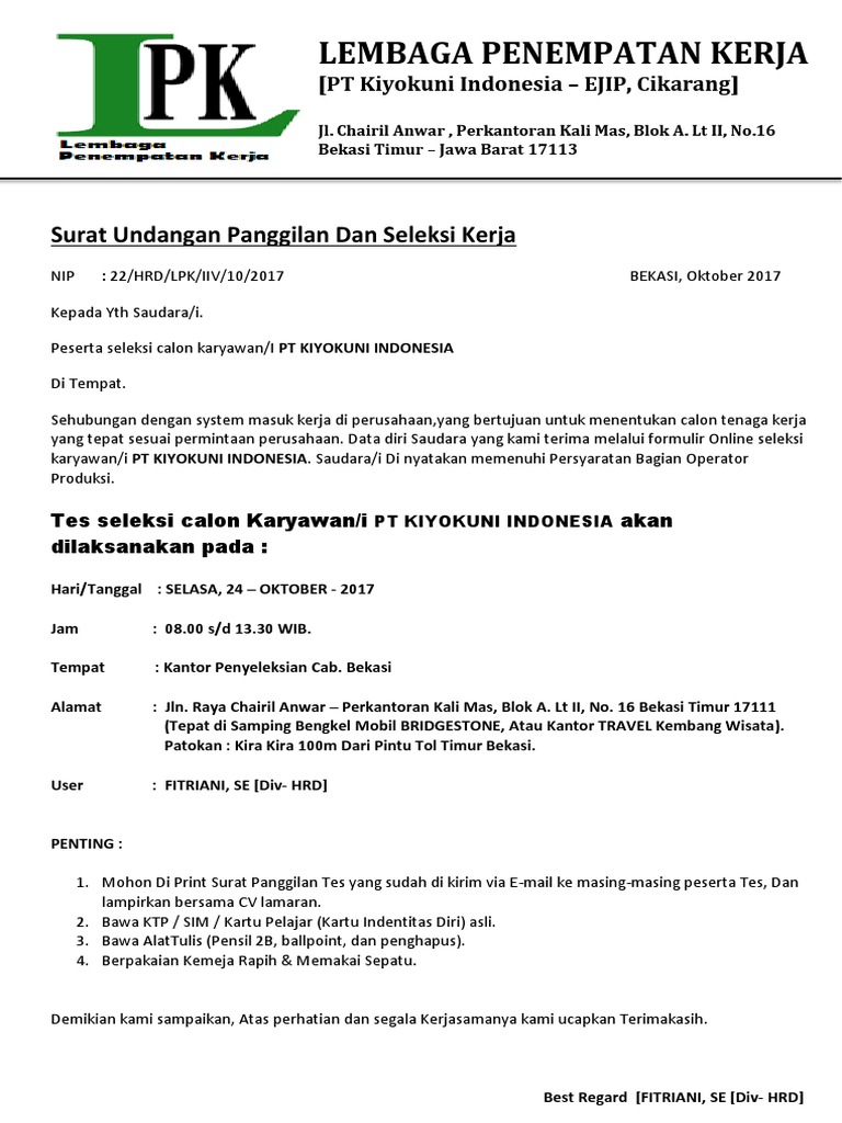 Surat Panggilan Kerja Pt Kiyokuni Indonesia Cikarang