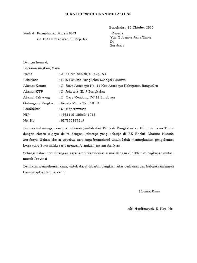 Jadi surat permohonan pindah tugas atau surat permohonan mutasi ini adalah surat resmi yang dipergunakan untuk mengajukan perpindahan tempat kerjatempat tugas. Terima kasih telah mampir disini. Contoh surat permohonan mutasi pindah tugas pns pada kesempatan ini akan mendistribusikan contoh surat lamaran tepatnya contoh surat permohonan mutasi kerja surat aplikasi mutasi ini berlaku untuk kepentingan umum pegawai negeri pegawai bank guru dan pegawai swasta.