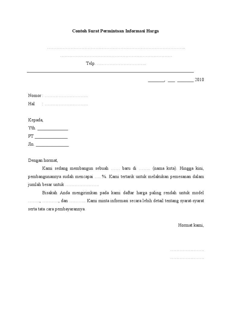 Contoh surat permintaan informasi. Contoh surat permintaan penawaran barang ini merupakan kebalikan dari contoh surat penawaran harga barang atau produk. Adapun masalah pemesanan akan segera kami lakukan setelah informasi dari anda. Kerjasama ini bisa jadi berupa pembelian barang secara berkala penggunaan jasa ataupun rencana untuk bekerjasama dalam hal lainnya.