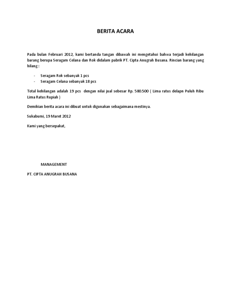 9 Contoh Berita Acara Rapat Kejadian Kegiatan Kehilangan Serah