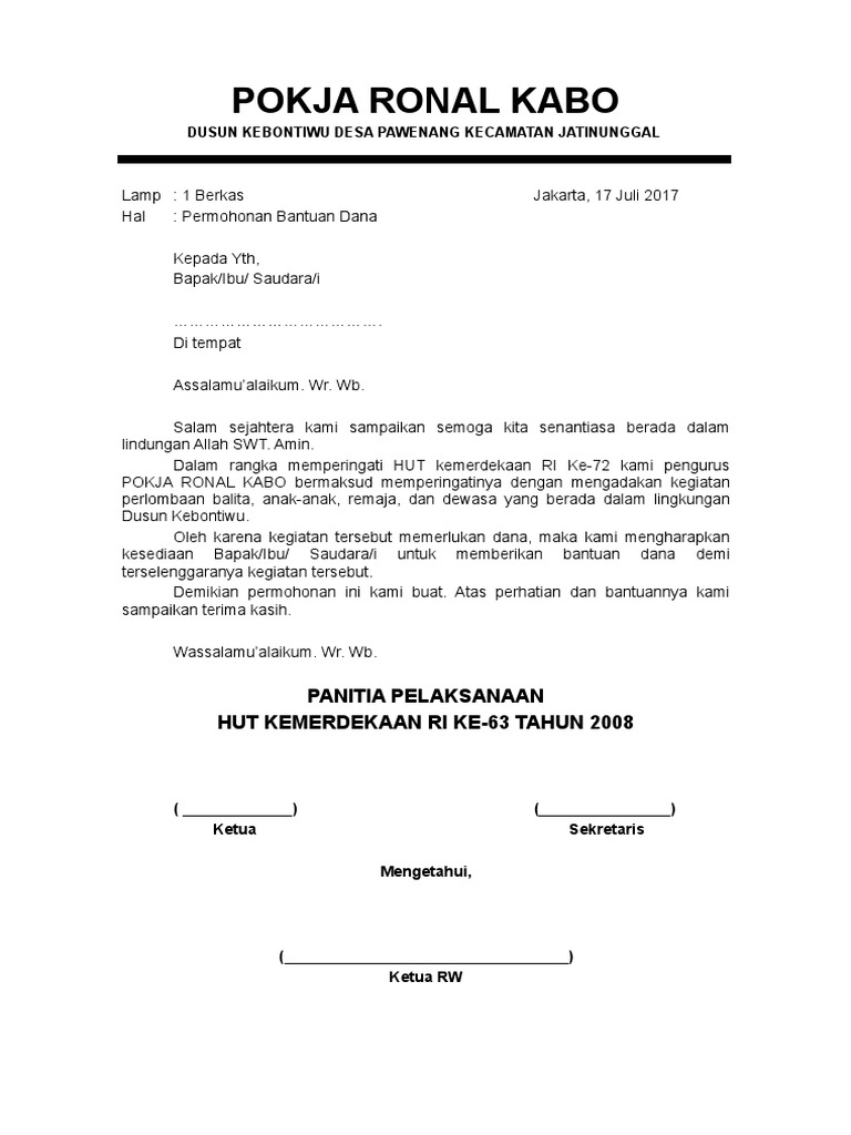 Contoh proposal acara kegiatan 17 agustus sesuai prosedur dalam contoh dibawah ini ada beberapa bagian yang wajib dituliskan agar proposal terlihat transparan yaitu susunan kepanitian acara dan juga estimasi biaya yang dibutuhkan untuk menggelar acara tersebut. Surat edaran dalam rangka peringatan hut ri ke 68.