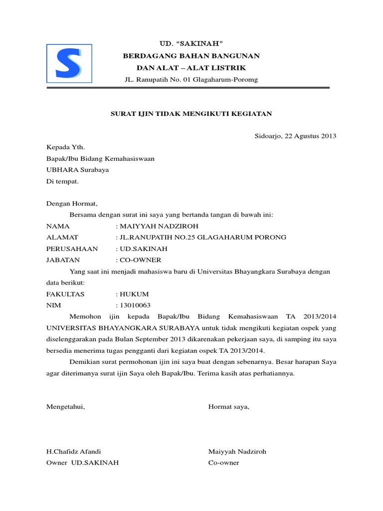 Contoh Surat Izin Tidak Mengikuti Kegiatan