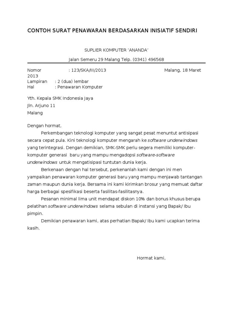 Silahkan diubah dan disesuaikan dengan keinginan anda. Surat penawaran adalah sebuah surat yang digunakan untuk menawarkan sebuah harga barang elektronika gadget motor mobil dll maupun sebuah jasa hubungan kerjakerjasama yang di lontarkan pada sebuah surat yang bertujuan untuk membuat sebuah ikatan kerja sama anrata pihak penjual dengan pihak pembeli.
