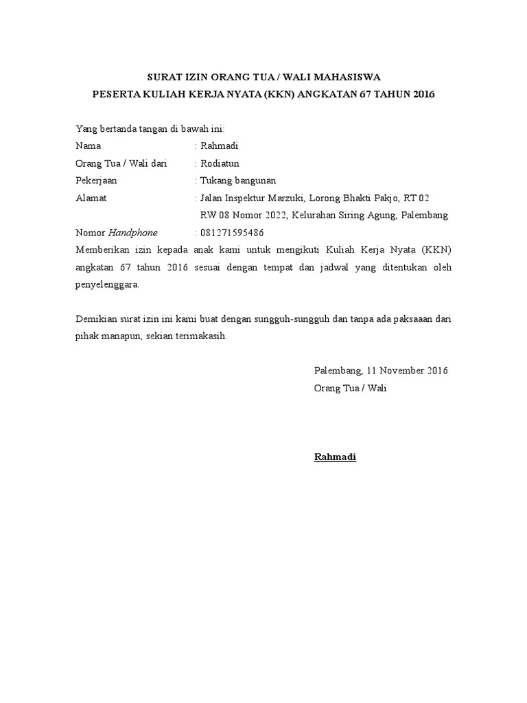 Contoh Surat Izin Orang Tua Untuk Kkn