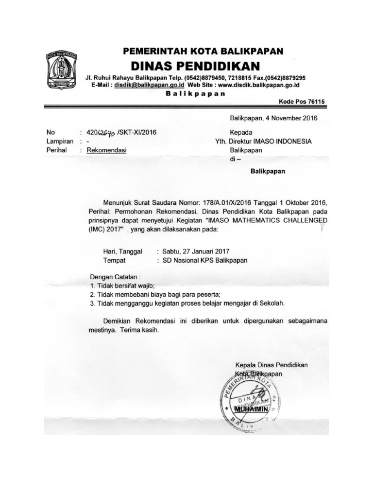 Contoh Surat Rekomendasi Dinas Pendidikan Untuk Lomba Matematika