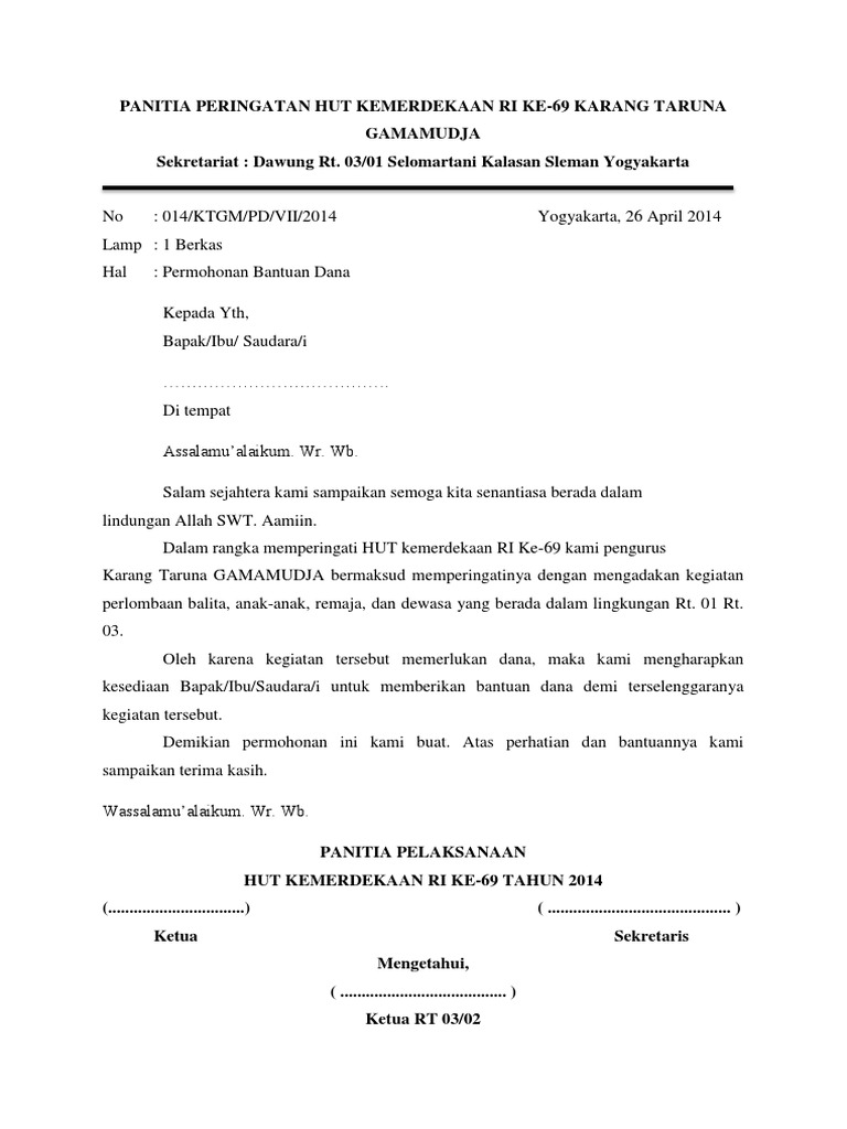 Pada bulan agustus biasanya banyak di lakukan kegiatan untuk memperingati hari kemerdekaan republik indonesia. Contoh proposal peringatan hut kemerdekaan ri seperti pelangi surat yasin asmaul husna ayat kursi juz amma contoh surat lamaran kerja dan puisi. Contoh surat permohonan bantuan dana dan proposal kegiatan hut ri contoh proposal pengajuan dana kegiatan 17 agustus contoh surat permohonan bantuan dana kegiatan 17 agustus surat permohonan sumbangan warga contoh surat edaran sumbangan 17 agustus contoh surat edaran 17 agustus contoh proposal kegiatan 17 agustus karang taruna contoh.