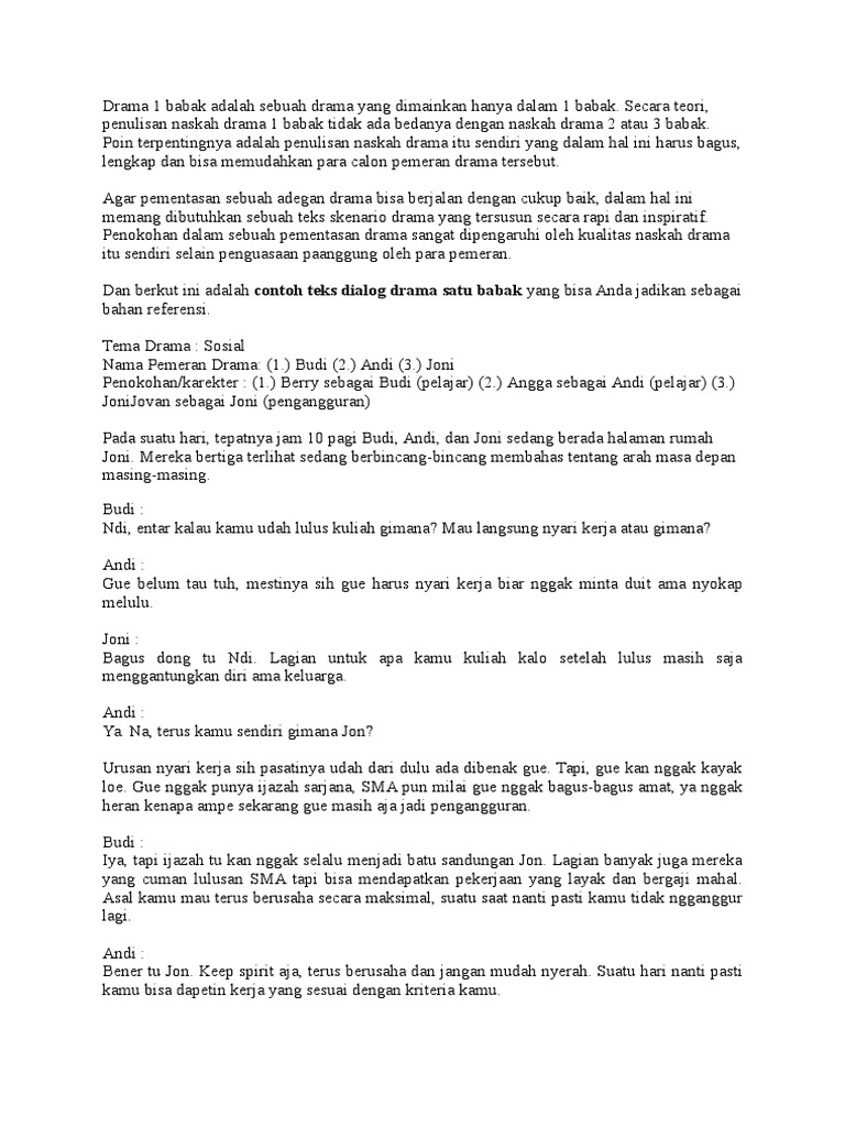 Naskah drama 1 babak. Drama 1 babak tema persahabatan teks drama 1 babak bisa bertemakan apa saja mulai tema persahabatan drama tema pendidikan atau teks dialog drama tema perjuangan. Secara teori penulisan naskah drama 1 babak tidak ada bedanya dengan naskah drama 2 atau 3 babak.