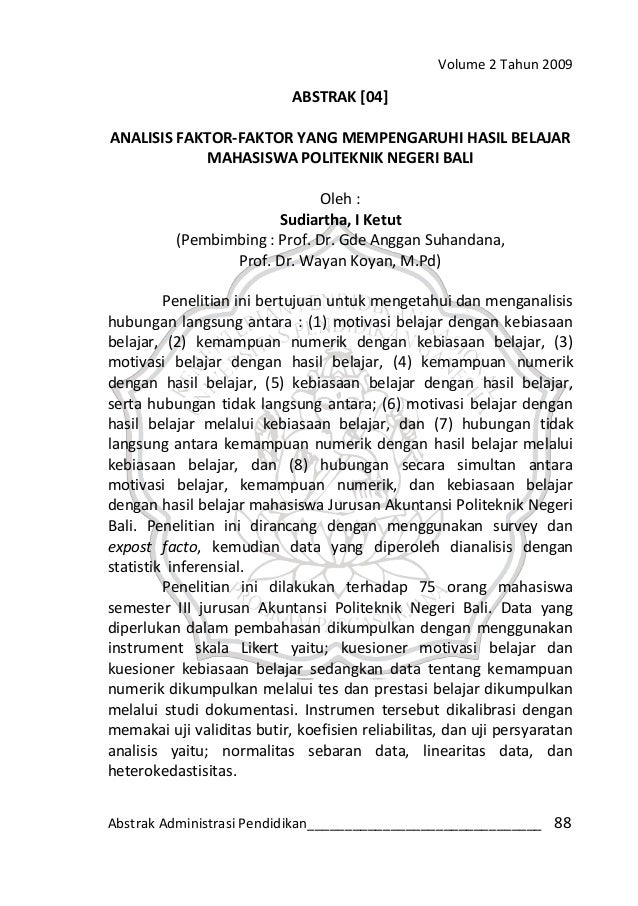 Inilah contoh abstrak skripsi yang baik dan benar pentingya abstrak tentu didasarkan dari tujuan utamanya untuk menghubungkan antara pemikiran dari penulis dengan pembaca skripsi. Abstrak adalah bentuk ringkas dari isi satu dokumen yang terdiri atas beberapa sisi utama dari satu tulisan serta mendeskripsikan isi serta cakupan dari tulisan. Cara membuat abstrak yang baik dan benar abstrak adalah representasi dari isi dokumen yang singkat dan tepat dan contoh abstrak biasanya mendeskripsikan suatu penelitian secara singkat dan sistematika yang dimulai dari nama peneliti nomor pokokinduk mahasiswa jika si peneliti seorang mahasiswa judul penelitian rumusan masalah teori teori metode penelitian variabel sumber data hasil.