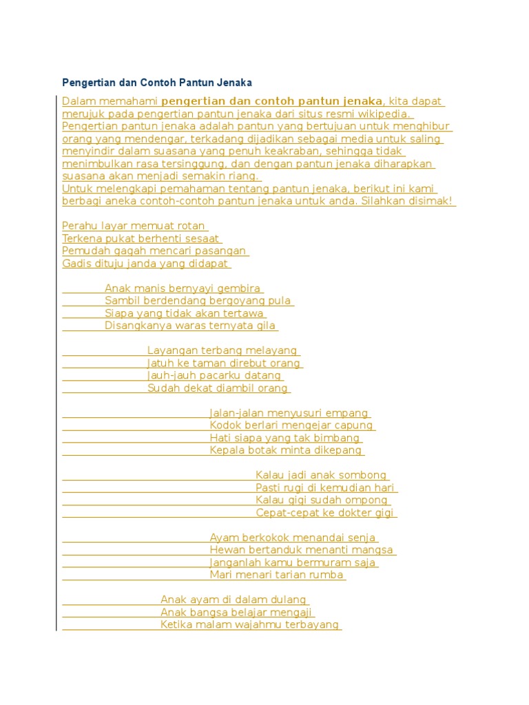 Kumpulan contoh pantun agama lucu nasehat jenaka remaja cinta teka teki pendidikan kilat persahabatan pertemanan budi pekerti akhlak adat dll. Kumpulan 20 macam contoh pantun mulai contoh pantun jenaka contoh pantun nasihat teka teki dan pantun lainnya yang bersajak a b a b dan juga a a a a home soal.