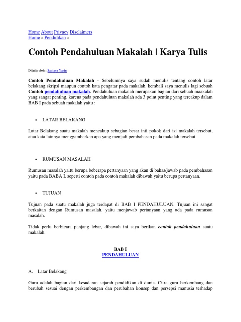 Menulis pendahuluan untuk makalah sejarah hendaknya tidak perlu terlalu panjang cukup sebanyak 1 2 halaman saja. Contoh pendahuluan makalah karya tulis sebelumnya saya sudah menulis tentang contoh latar belakang skripsi maupun contoh kata pengatar pada makalah kembali saya menulis lagi sebuah contoh pendahuluan makalah. Contoh pendahuluan makalah ini saya kumpulkan dari beberapa contoh makalah dengan berbagai tema baik itu yang saya ambil dari blog contoh artikel ini dan dari beberapa sumber lain yang mungkin sesuai dengan tema makalah yang sedang anda susun dan tentu saja pendahuluan dalam makalah yang sedang anda baca ini dapat anda edit jika terdapat kalimat yang kurang sesuai menurut anda.