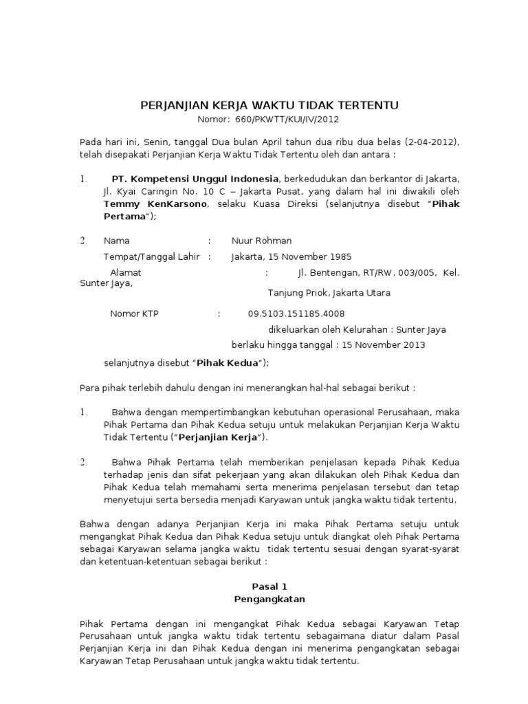 Contoh Perjanjian Kerja Karyawan Tetap Kontrak